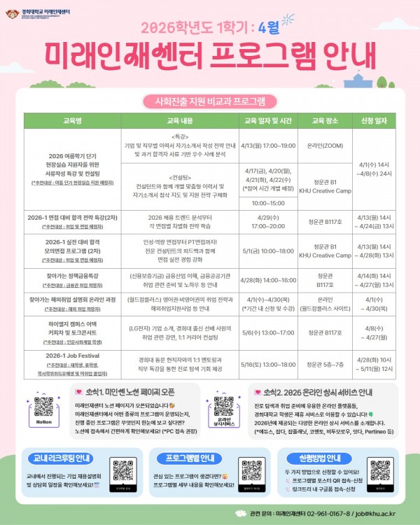 [미래인재센터] 2026학년도 4월 사회진출 지원 비교과 프로그램 안내 페이지 정보 작성자 체육대학 댓글 0건 조회 2회 작성일 2026-04-07 17:15 본문 목록 다음글[미래인재센터(국제)] 2026학년도 1학기 현장실습 합격을 위한 서류 작성 캠프 참여자 모집(~4/9.15시) 26.04.07 댓글목록 댓글목록 등록된 댓글이 없습니다.