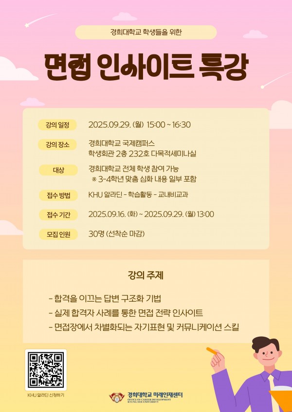 <면접 인사이트 특강> 참여자 모집 안내(~ 9/29) 페이지 정보 작성자 체육대학 댓글 0건 조회 85회 작성일 2025-09-19 09:36 본문 목록 이전글[GS칼텍스] 2025년 하반기 신입/경력사원 채용(~9.30) 25.09.19 다음글울진군 공무직근로자(수영강사) 채용 재공고(~ 9/23) 25.09.17 댓글목록 댓글목록 등록된 댓글이 없습니다.