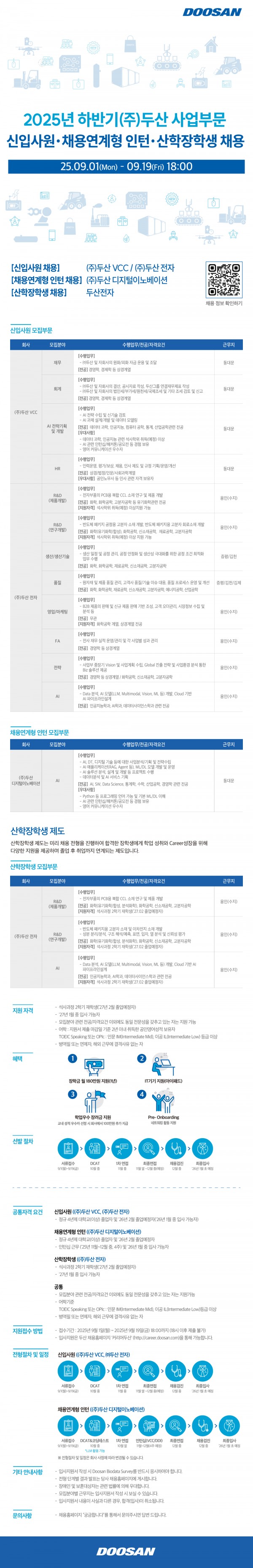 [(주)두산 사업부문] 2025년 하반기 신입사원·채용연계형 인턴·산학장학생 채용 ( ~ 9/19(금) 18시)