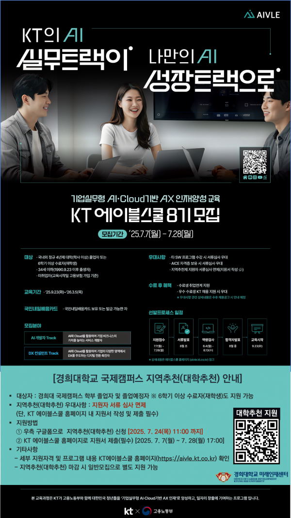 [미래인재센터] KT 에이블스쿨(AIVLE School) 8기 모집 안내(~7.24(목)까지 대학추천 모집)