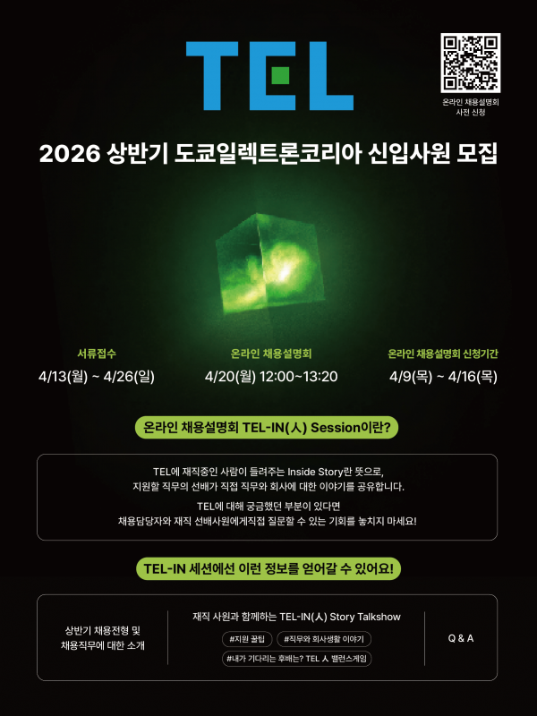 2026 상반기 도쿄일렉트론코리아 신입사원 모집 온라인 채용설명회 페이지 정보 작성자 체육대학 댓글 0건 조회 2회 작성일 2026-04-13 14:52 본문 목록 다음글[기아] 2026상반기 기아 신입/전환형 인턴 채용 (신입 ~4/13(월) 11시, 인턴 ~4/20(월) 11시까지) 26.04.09 댓글목록 댓글목록 등록된 댓글이 없습니다.