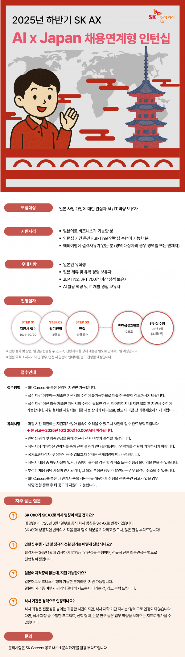 (SK AX) 2025 하반기 SK AX AI x Japan 채용연계형 인턴십(~10/20 10:00AM)