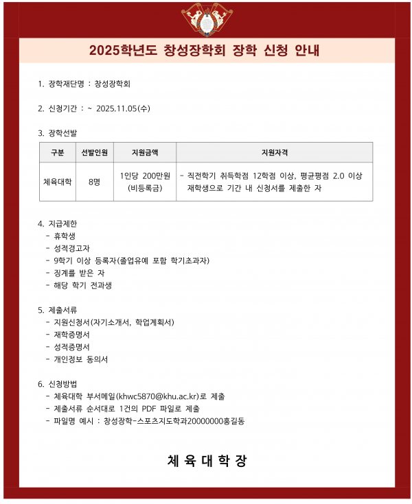 [학생지원센터(장학)] 2025학년도 창성장학회 장학 신청 안내(~11/5) 페이지 정보 작성자 체육대학 댓글 0건 조회 23회 작성일 2025-10-29 11:28 본문 . 첨부파일 창성장학회 장학금 신청서 및 개인정보동의서.hwp (35.5K) 7회 다운로드 | DATE : 2025-10-29 11:28:06 목록 다음글[학생지원센터(장학)] 2025학년도 2학기 경희목련장학(국제C 구,장학사정관제장학) 신청 안내(~10/26) 25.10.01 댓글목록 댓글목록 등록된 댓글이 없습니다.