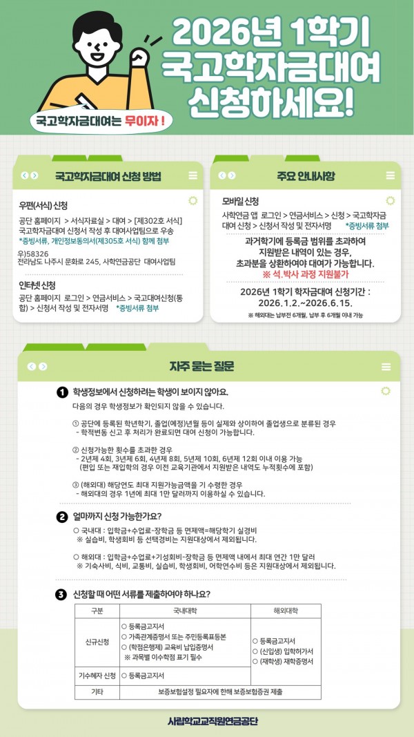 2026년도 1학기 국고학자금대여 신청 안내 페이지 정보 작성자 체육대학 댓글 0건 조회 76회 작성일 2026-02-10 17:24 본문 첨부파일 국고학자금 신청 매뉴얼2026.02.05..pdf (1.7M) 5회 다운로드 | DATE : 2026-02-10 17:24:05 목록 이전글2026학년도 신/편입생 새내기를 위한 장학신청 안내 26.02.20 다음글2026학년도 1학기 주거안정장학금 2차 신청 안내(~3/17. 18시) 26.02.09 댓글목록 댓글목록 등록된 댓글이 없습니다.