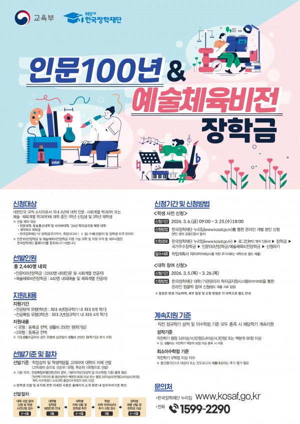 [학생지원센터(장학)] 2026년 국가우수장학(인문100년/예술체육비전)신규장학생 사전신청 안내(~3/25.18시)